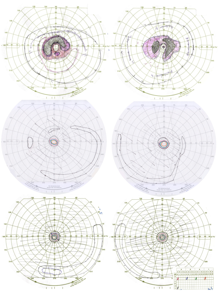 Fig. 3 Deidentified Goldmann visual field results from affected participants III-1 and III-4. The upper row shows results from participant III-1 at 61 years of age showing dense mid-peripheral ring scotomas extending from 5 to 30 degrees. The middle row shows results from participant III-4 at 43 years old showing extensive field loss beyond the mid-periphery. The bottom row shows results from participant III-4 at 55 years of age showing further decline of far peripheral islands of vision.