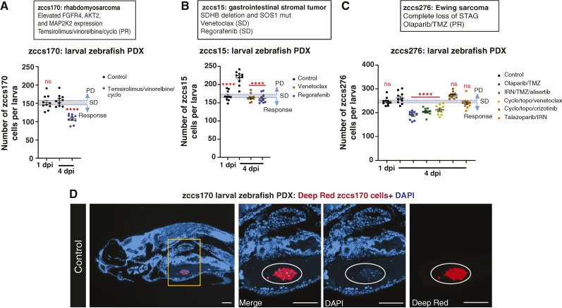 Larval zebrafish drug efficacy studies for patients with no available mouse PDX. A to C, Patient information, alongside larval zebrafish tumor cell numbers for each therapy for rhabdomyosarcoma zccs170 (A), gastrointestinal stromal tumor zccs15 (B), and Ewing sarcoma zccs276 (C). For larval zebrafish data, error bars represent mean ± SEM, each colored dot represents an individual larva, and a threshold is based on SEM of 1 dpi. Statistical analysis was conducted using a one-way ANOVA with the Dunnett multiple comparisons test, comparing the mean of each treatment group with control (4 dpi), P values: *, < 0.05; **, < 0.01; ***, < 0.001; ****, < 0.0001. D, Representative image of a five microns sectioned control larval zebrafish xenograft for patient zccs170. Deep Red–labeled patient cells present in the YS 4 dpi and labeled with DAPI to confirm viability. White circle in the images point to zccs170 tumor cells. Images were taken with 10× and 20× magnification. The scale bar is 100 µm. dpi, days post-injection.