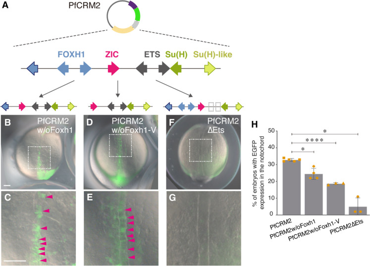 (A) Diagram of the reporter constructs of PfCRM2 with deletions of the Foxh1 sites or mutations of the Ets sites. The additional Foxh1 site in the vector is indicated by the leftmost blue arrow with black outline. (B to G) Representative images show zebrafish embryos injected with the truncated or mutated PfCRM2 reporter constructs. Magnifications of the notochord regions highlighted by white boxes in (B), (D), and (F) are shown in (C), (E), and (G), respectively. EGFP signals in the notochord cells are indicated with magenta arrowheads. Embryos are oriented in the dorsal view with anterior to the top. Top panels [(B), (D), and (F)] and bottom panels [(C), (E), and (G)] are in the same scale as indicated in (B) and (C), respectively. w/o, without; delta symbol (△), mutation. All scale bars represent 100 μm. (H) Percentages of zebrafish embryos exhibiting EGFP signals in the notochord among EGFP-positive embryos. Each yellow data point represents the result of a single experiment. The gray columns are average results from at least three biological replicates, with error bars showing SDs. *P < 0.05; ****P < 0.0001.