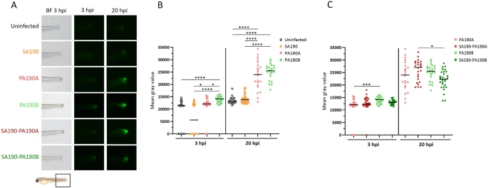 Fig. 3 Inflammation in a mono- or co-infection context upon infection of a zebrafish il1b:GFP reporter line. (A) Images of the GFP signal at the infection site (indicated by a black square below the images) in il1b: GFP larvae. Larvae wounded at the tail were infected by immersion with SA190 and/or competitive strain PA190A or coexistent strain PA190B and imaged at 3 hpi or 20 hpi (the same larva is imaged at the two time points). BF = Bright-Field. (B) Quantification of the GFP signal in mono-infected larvae and non-infected injured embryos. Black bars represent medians. Kruskal-Wallis test: *P < 0.05, ****P < 0.0001. (C) Quantification of the GFP signal in larvae infected by PA190A or PA190B in the context of mono-infection or co-infection with SA190. Results from panels B and C were collected in the same experiments and the same dataset was used for mono-infections with PA190A and PA190B in both panels. Black bars represent medians. Kruskal-Wallis test: *P < 0.05, *** P < 0.001. Experiments have been performed at least three times (n ≥ 3), representing at least 22 fishes per condition.