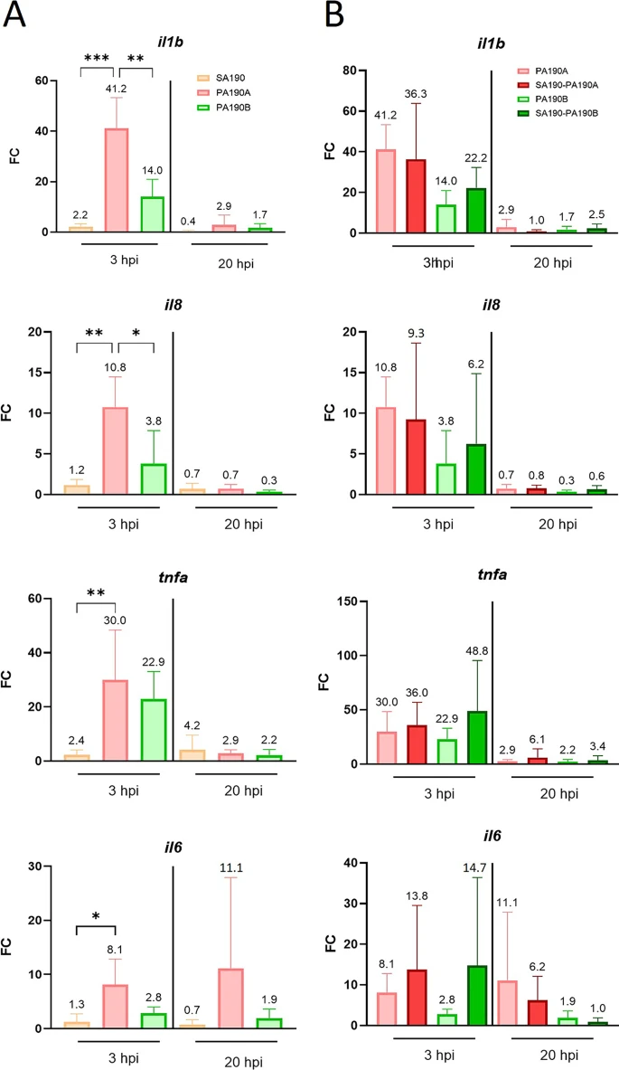 Fig. 4 Expression of zebrafish pro-inflammatory genes in response to mono- and co-infections. Expression of il1b, il8, tnfa and il6 genes was measured using RT-qPCR and normalized with the expression of ef1a gene. RNA was extracted from 10 larvae after mono- or co-infections at 3 hpi and 20 hpi. (A) Inflammatory response upon mono-infections. (B) Inflammatory response caused by PA190A and PA190B in the context of mono- or co-infection. Results from panels A and B were collected in the same experiments and the same dataset was used for mono-infections with PA190A and PA190B in both panels. Data are presented as fold change (FC) of gene expression in infected larvae vs. non infected with FC = 2^(−ΔΔCT). Values are the means ± standard error of the mean (SEM) of four replicates (n = 4 from pools of 10 larvae per timepoint, 40 larvae in total). Statistical analysis was done using a one-way ANOVA followed by a Tukey post-hoc test. *P < 0.05; **P < 0.01; ***P < 0.001.