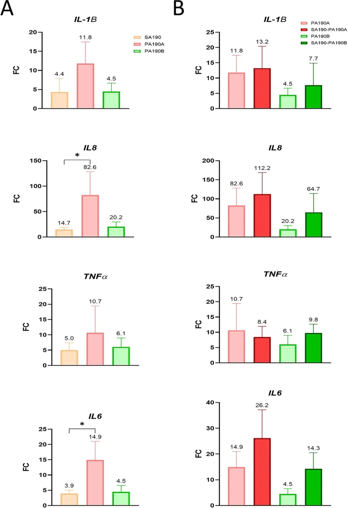Fig. 5 Expression of CFBE cells pro-inflammatory genes in response to mono- and co-infections. Expression of IL1B, IL8, TNFα and IL6 genes was measured using RT-qPCR and normalized with the expression of GAPDH and RPS18 genes. RNA was extracted from CFBE cells after 6 h of infection. (A) Inflammatory response upon mono-infections. (B) Inflammatory response caused by PA190A and PA190B in the context of mono- or co-infections. Results from panels A and B were collected in the same experiments and the same dataset was used for mono-infections with PA190A and PA190B in both panels. Data are presented as FC of gene expression of infected cells vs. non infected cells with FC = 2^(−ΔΔCT). Values are the means ± standard error of the mean (SEM) of four replicates. Statistical analyses were done using a Kruskal-Wallis test followed using a Dunn test. *P < 0.05.