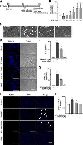 Fig. 2 Antiapoptotic effects of RDM in 6-OHDA-treated SH-SY5Y cells. (A) Experimental flowchart. On day 1, cells were plated. On day 2, cells were pretreated with RDM for 1 h and then induced with 6-OHDA for 16 h to cause neurotoxicity. After that, cell viability, cell apoptosis, and caspase 3 activity were assessed using alamarBlue stain, Hoechst and TUNEL stain, and a caspase 3 colorimetric assay kit, respectively. (B) Cell viability was measured using the alamarBlue assay to analyze the neuroprotective activity of various concentrations of RDM (10–4–10 μM). The relative neuroprotection rates (relative protection) were calculated based on cell viability, with the relative cell protection of untreated cells presented as 0%. (C) Phase-contrast images of control, 6-OHDA (20 μM), 6-OHDA (20 μM)/RDM (10 μM), and RDM (10 μM) groups. Cell morphology was observed by using a microscope. Cell death patterns such as shrinkage, floating, and deformation are indicated by white arrows. (D) Microscopic images of the effects of RDM (10 μM) on 6-OHDA-treated SH-SY5Y cells by Hoechst stainings. (E) Cell apoptosis was quantified by measuring the blue fluorescence signals from panel D, indicating condensed or fragmented nuclei. (F) The images of TUNEL staining and nuclei were counterstained with DAPI (blue). White arrows indicate cells with TUNEL fluorescence signals. (G) The TUNEL signal was quantified by measuring the green fluorescence signals from panel F. (H) Caspase 3 activity assays with RDM (10 μM) treatment. The relative caspase 3 activity of control cells is presented as 100% for normalization. *p < 0.05 compared with the control group; #p < 0.05 compared with the 6-OHDA alone group. RDM, rhodoptilometrin; 6-OHDA, 6-hydroxydopamine; TUNEL, terminal deoxynucleotidyl transferase dUTP nick end labeling; and DAPI, 4′,6-diamidino-2-phenylindole