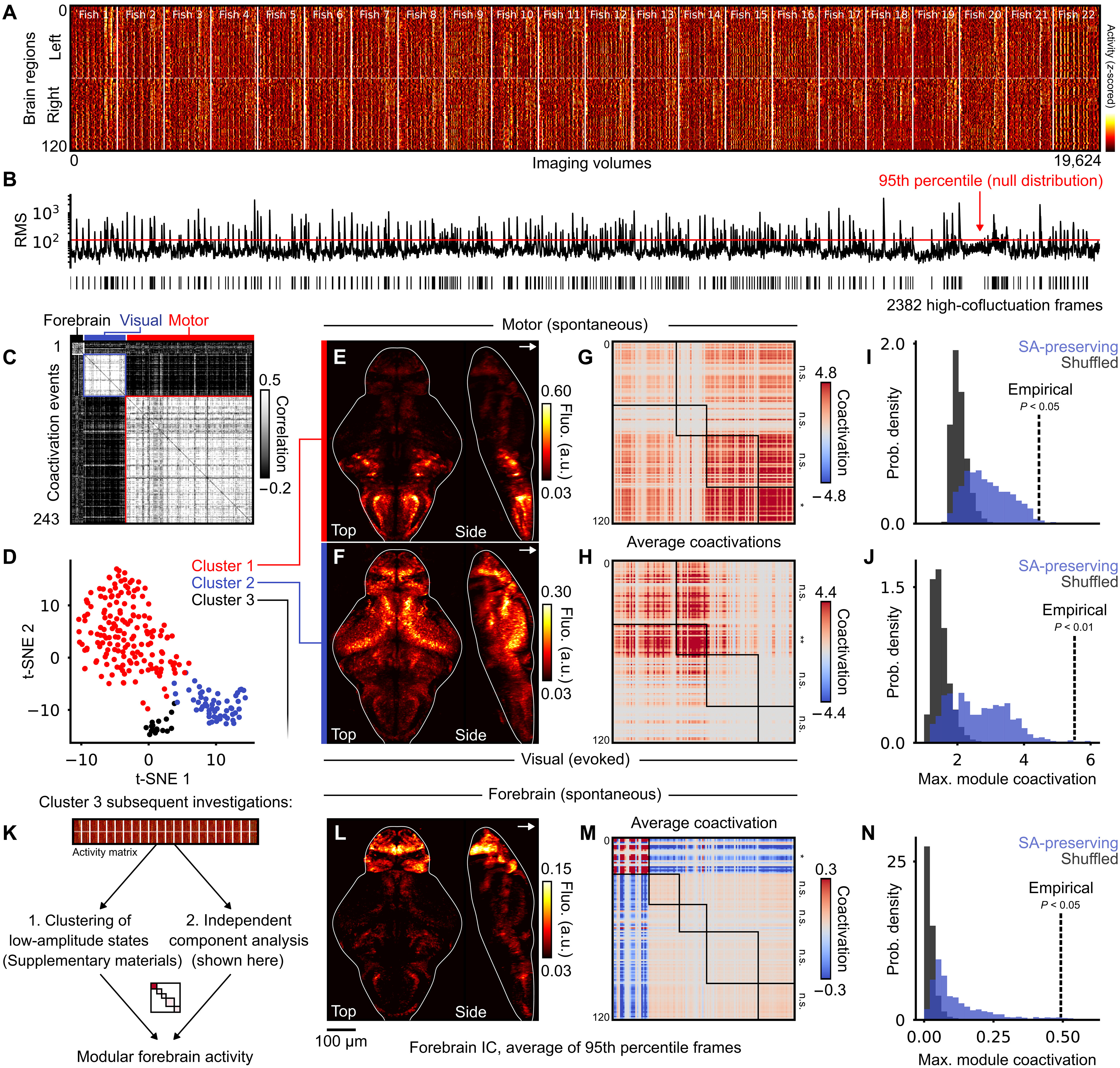 Fig. 4 Mesoscopic coactivation patterns coincide with the modular organization of SC. (A) Raster plot of z- scored regional activity across 22 larvae. Left and righthemispheres are plotted in the upper and lower halves, respectively. (B) Root-mean-square (RMS) of regional coactivation values for each of the corresponding frames in(A); the red line indicates a statistical threshold for high coactivation events (P < 0.05, false discovery rate fixed at α = 0.05 using the Benjamini-hochberg procedure).(C) correlation matrix of 243 detected events, separated into three clusters that are illustrated in the following panel. (D) t-Sne projection of 243 high-amplitude events,with three clusters identified using density-based clustering. (E and F) Raw data projections of the two main clusters, coregistered and averaged across larvae (n = 22);top; high- amplitude motor events; bottom: high- amplitude visual responses to dark stimuli; contrast is adjusted after averaging (see Materials and Methods). a.u., arbi-trary units. (G and H) Average coactivation matrices of the two main clusters, reordered according to four structural modules; statistical significance of module coactiva-tions is indicated on right matrix borders. (I and J) null distributions of maximal module coactivation values in SA-preserving and SA-breaking surrogates; dashed linesindicate empirical coactivation values. (K) two independent analyses recover modular forebrain activity that was weakly detected as cluster 3 in the previous clusteringanalysis. (L) Averaged raw fluorescence from frames corresponding to the 95th percentile of forebrain ic activity. (M) Average coactivation matrix of frames belonging tothe 95th percentile of forebrain ic activity. (N) null distributions of forebrain modularity, similar to (i) and (J).