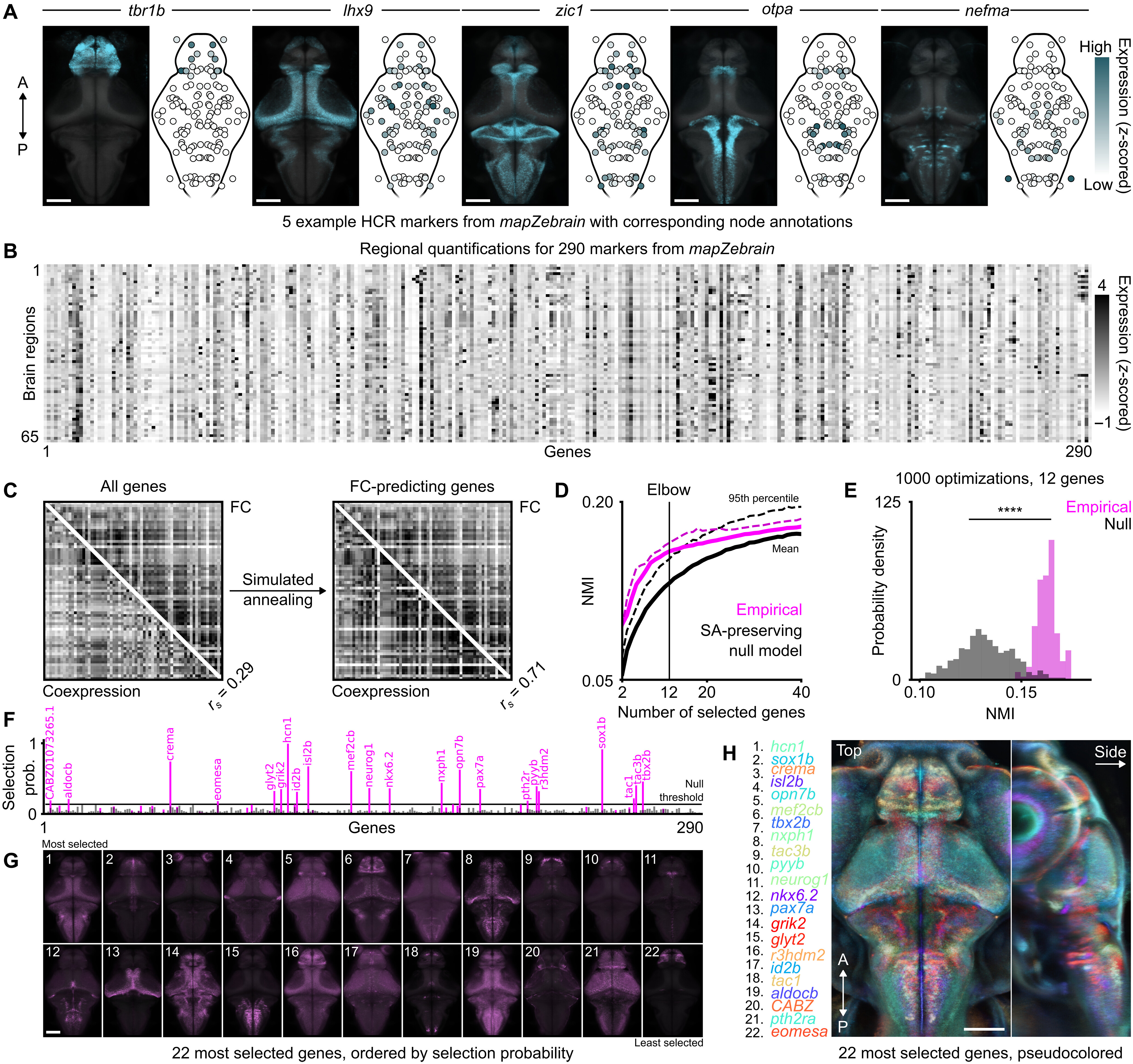 Fig. 7 Gene coexpression predicts FC. (A) Five example fluorescence in situ hybridization markers from mapZebrain (left: top view, 90th percentile projections), withcorresponding regional annotations (right: in black outlines); intensities are scaled arbitrarily per gene for visualization. (B) Regional gene expression matrix; each row(brain region) is z-scored independently. (C) Left: cGe matrix across all 290 genes, compared with the Fc matrix; r s denotes the Spearman coefficient. Right: cGe matrix of12 optimized genes obtained through simulated annealing, compared with Fc. (D) Average (full lines) and 95th percentile (dotted lines) of optimized nMi between cGeand Fc for varying numbers of genes used in simulated annealing runs; pink curves correspond to empirical gene sets, whereas black curves correspond to spatiallyshuffled genes; a vertical line indicates the elbow of the average empirical curve; 1000 optimization runs per number of genes. (E) nMi distributions at the predeterminedelbow point for empirical and null optimization results using 12 genes (P < 0.001, t test). (F) Selection frequency of each gene across 1000 simulated annealing runs; pinkbars correspond to empirical genes, whereas black bars correspond to spatially shuffled gene datasets; a horizontal bar denotes a selection threshold, with significantgene names indicated above. (G) 90th percentile intensity projections of 22 significant gene markers; gene names are indicated in the next panel, ordered by selectionprobability (left to right, top to bottom). (H) Overlap of 22 pseudocolored gene markers; pixelwise color contrast is used to highlight the most prominent genes at eachlocation; colors are used to accentuate the global patterns, rather than to precisely distinguish individual genes (which are displayed separately in the previous panel).A, anterior; P, posterior; SA, spatial autocorrelation. Scale bars, 100 μm.