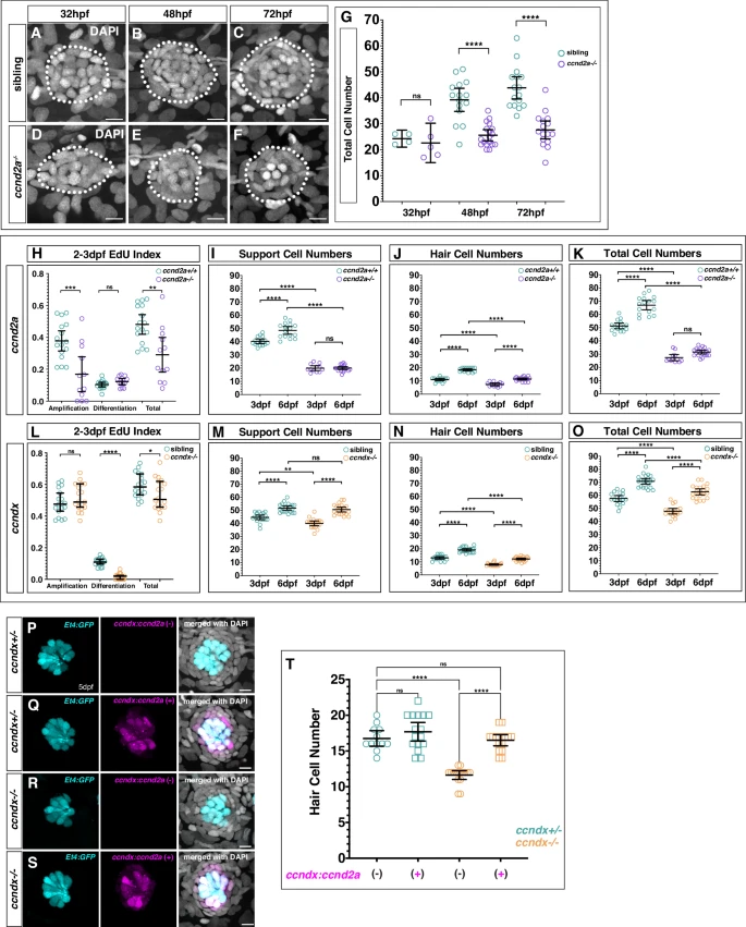 Fig. 3 ccnd2a and ccndx are required for support cell and progenitor cell proliferation during development, respectively.A–F DAPI stained nuclei of neuromasts from sibling (A - C) or ccnd2a−/− (D - F) at 32, 48 or 72 hpf. Scale bar = 10 µm. G Quantification of total cell number from DAPI stained neuromasts in sibling and ccnd2a−/− at 32, 48 or 72 hpf. ns = not significant p = 0.98, ****p < 0.0001, Two-way Anova (genotype, condition) with Šidák multiple comparisons test. Data are presented as mean values + /− 95% confidence intervals. n = 4 for 32 hpf sibling, n = 5 for 32 hpf ccnd2a−/−, n = 15 for 48 hpf sibling, n = 18 for 48 hpf ccnd2a-/, n = 16 for 72 hpf sibling and i = 16 for 72 hpf ccnd2a−/−. H Comparison of wildtype and ccnd2a−/− amplifying, differentiation or total EdU indexes between 2 − 3 dpf. ccnd2a−/− has reduced amplification and total EdU indexes. Data are presented as mean values + /− 95% confidence intervals. ns = not significant p = 0.55, ***p = 0.0008, **p = 0.0016, two-tailed t-test. n = 16 for ccnd2a+/+ and n = 12 for ccnd2a−/−. Comparisons of wildtype and ccnd2a−/− support- (I) hair cell- (J) and total (K) cell numbers. ns = not significant p = 1 for (I) and p = 0.087 (K), ****p < 0.0001, Two-way Anova (genotype, condition) with Šidák multiple comparisons test. Data are presented as mean values + /− 95% confidence intervals. n = 16 for 3dpf wildtype, n = 16 for 6dpf wildtype, n = 12 for 3dpf mutant and n = 20 for 6dpf mutant. L Comparison of sibling and ccndx−/− amplifying, differentiation or total EdU indexes between 2 − 3 dpf. Similarly to 5 − 6 dpf, ccndx−/− neuromasts show reduced differentiation and total EdU indexes and no change in the amplification index. Data are presented as mean values + /− 95% confidence intervals. ns = not significant p = 0.25, ****p < 0.0001, *p = 0.0467, two-tailed t-test. n = 18 for both. M– O Comparisons of sibling and ccndx−/− support-, hair cell- and total cell numbers. Data are presented as mean values + /− 95% confidence intervals. ns=not significant p = 0.91, ****p < 0.0001, **p = 0.0019, Two-way Anova (genotype, condition) with Šidák multiple comparisons test. P–S 5 dpf neuromasts from ccndx+/- (P, Q) or ccndx−/− (R, S) expressing sqEt4:GFP without or with ccnd2a-P2A-mScarlet-I driven by the ccndx promoter. Scale bar = 10 µm. T Quantification of sqEt4:GFP+ hair cells in ccndx+/- or ccndx−/− neuromasts at 5 dpf without or with ccnd2a-P2A-mScarlet-I. n = 12 for ccndx+/-/ccnd2a-P2A-mScarlet-I- and n = 16 for all other groups. Data are presented as mean values + /− 95% confidence intervals. ns = not significant p = 0.11 and p = 1, ****p < 0.0001, Two-way Anova (genotype, condition) with Šidák multiple comparisons test.
