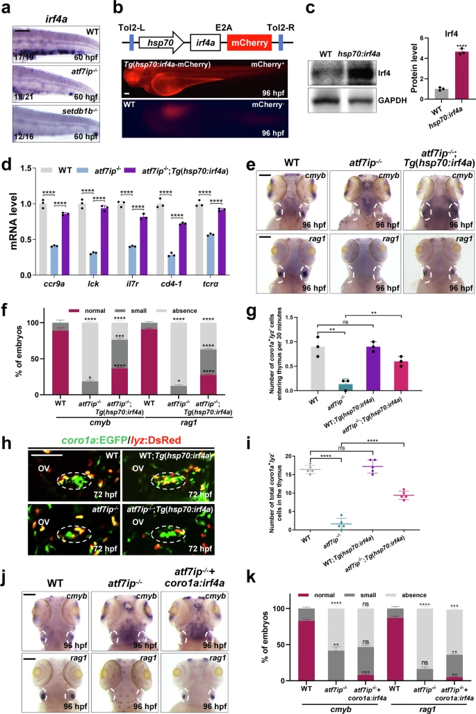 Fig. 5 T cell differentiation and migration are impaired due to irf4a reduction in atf7ip−/− mutants.a WISH analysis of irf4a in CHT of WT, atf7ip−/− mutants and setdb1b−/− mutants at 60 hpf. b Schematic diagram showing the construct of full-length irf4a gene driven by hsp70 promoter on tol2 vector (up). Fluorescent microscopy depicting the expression of hsp70:irf4a-mCherry in WT at 96 hpf (down). c Immunoblot and quantification depicting the protein level of Irf4 in WT and heat-shocked Tg(hsp70:irf4a)embryos at 96 hpf, n = 3. d qPCR analysis of ccr9a, lck, il7r, cd4-1 and tcra in whole embryos of WT, atf7ip−/− mutants and heat-shocked atf7ip−/−;Tg(hsp70:irf4a) embryos at 96 hpf, n = 3. e, f WISH analysis of cmyb and rag1 in thymus (white circles) of WT, atf7ip−/− mutants and heat-shocked atf7ip−/−;Tg(hsp70:irf4a) embryos at 96 hpf. Red, dark gray and light gray squares indicate normal (cmyb/rag1: 45-90), small (cmyb/rag1: 10-45), and absence (cmyb/rag1: 0-10) foci in thymus, respectively. Quantifications of WISH distribution are shown in (f), 3 independent experiments. g Number of coro1a:EGFP+/lyz:DsRed- cells entering the thymus every 30 min in WT, atf7ip−/− mutants, heat-shocked Tg(hsp70:irf4a) and atf7ip−/−;Tg(hsp70:irf4a) embryos, n = 3. h, i Confocal imaging showing lymphoid progenitors in thymus (white circles) of WT, atf7ip−/− mutants, heat-shocked Tg(hsp70:irf4a) and atf7ip−/−;Tg(hsp70:irf4a) embryos in coro1a:EGFP/lyz:DsRed transgenic background at 72 hpf. Quantification is shown in (i), n = 5. j, k WISH displaying cmyb and rag1 expression in thymus (white circles) in WT, atf7ip−/− mutants and atf7ip−/− mutants injected with coro1a-irf4a/tol2 constructs at 96 hpf. Red, dark gray and light gray squares indicate normal (cmyb/rag1: 45-90), small (cmyb/rag1: 10-45), and absence (cmyb/rag1: 0-10) foci in thymus, respectively. Quantifications of WISH phenotype distribution are shown in (k), 3 independent experiments. Scale bar, 100 μm (a, b, e, h, j). Quantifications (c, d, f, g, i, k) are represented as mean ± SD; ns, P > 0.05, *P < 0.05, **P < 0.01, ***P < 0.001, ****P < 0.0001. Student’s t test (unpaired, two-tailed). Source data are provided as a Source Data file.