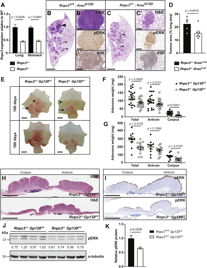 (A) RT-qPCR analysis of Rnpc3 mRNA extracted from 160-day-old WT and Rnpc3 heterozygous mouse stomach and lung tissue (n = 4, 2 males and 2 females). Results are expressed as mean ± SEM. Significance was assessed using multiple unpaired t tests. (B, C) Representative hematoxylin and eosin-stained lung sections 180 days after intranasal administration of adenoviral Cre recombinase (AdCre). Arrows and arrowhead indicate foci of atypical adenomatous hyperplasia (AAH) and adenoma, respectively. These lesions are pERK and 65 K positive. Scale bar in (B, C) is 2 mm. Scale bar in (B′, C′) is 200 μm. (D) Quantification of hyperplasia in sections of lung, expressed as a percentage of total lung area. Results are expressed as mean ± SEM, n = 5 or 7 per genotype. Significance was assessed using a Student’s t test. (E) Representative adenomas in the corpus (arrowhead) and antral (arrow) regions of the glandular stomach of mice. Scale bar is 5 mm. (F) Total adenoma weight at 100 d of age, n = 20 or 21 per genotype. Data are expressed as mean ± SEM. (G) Total adenoma weight at 180 d of age, n = 10 or 14 per genotype. Data are expressed as mean ± SEM. Significance was assessed with a Student’s t test with Welch’s correction. (H) Histological sections of the glandular stomach stained with H&E at 100 d. (I) Immunocytochemical localization of pERK1/2 indicates active MAPK signalling at the luminal surface of adenomas in 100 d old Gp130F/F mice. Scale bar in (H, I) is 2 mm. (J) Western blot analysis of pERK1/2 proteins in antral adenomas from four individual mice/genotype at 100 d. Values shown are normalized by reference to the α-tubulin loading control and relative to Rnpc3+/+; Gp130F/F samples. (K) Quantification of pERK1/2 protein abundance shown in (J). Data are expressed as mean ± SEM, n = 4. Significance was assessed with a Student’s t test. Source data are available online for this figure.