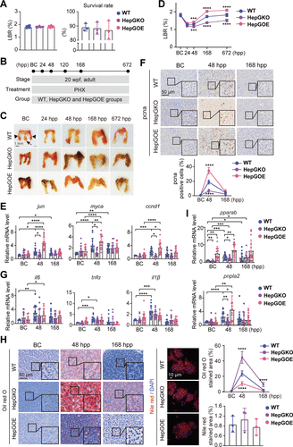 Fig. 2 Hep-gmfb promotes liver regeneration and prevents hepatic steatosis post PHX. A: LBR and survival rate of zebrafish from WT, HepGKO, and HepGOE groups. For the LBR, n = 8 samples, one fish at 20 wpf per sample. For the survival rate analysis, n = 3 replicated groups, 100 fish at 5 dpf per group. B: schematic illustration of the construction of zebrafish PHX model with WT, HepGKO, and HepGOE lines. C: representative images of livers from WT, HepGKO, and HepGOE groups at indicated timepoints post-PHx. In BC panel, the black arrowheads indicate the two lateral lobes, the black arrow indicates the ventral lobe, and the red short, dashed line indicates the PHX incision site. Scale bar = 1 mm. n = 8 fish per group. D: LBR of zebrafish from WT, HepGKO, and HepGOE groups at indicated timepoints post-PHx. n = 8 fish per group. One-way ANOVA, ***P < 0.001, ****P < 0.0001 vs. WT group. E, G, and I: expression levels of indicated genes jun, myca, and ccnd1 in (E); il6, tnfα, and il1β in (G); and pparab and pnpla2 in (I) in liver samples from WT, HepGKO, and HepGOE groups at BC, 48 hpp and 168 hpp. n = 15 fish per group. Data were presented as relative expression levels. One-way ANOVA, *P < 0.05, **P < 0.01, ***P < 0.001, ****P < 0.0001 vs. BC or WT group. F: representative anti-pcna immunochemical images in liver sections and quantification of pcna positive staining cell from WT, HepGKO, and HepGOE groups at BC, 48 hpp and 168 hpp. Scale bar = 50 μm. n = 8 fish per group. One-way ANOVA, ****P < 0.0001 vs. WT group. H: representative images of lipid droplets with oil red O staining in liver slices of PHX model, and the Nile red staining lipid droplets in zebrafish primary hepatocytes from WT, HepGKO, and HepGOE groups, and quantification of the positive staining areas. Scale bar = 50 μm for oil red O staining and 10 μm for Nile red staining. n = 12 samples for oil red O staining, 1 fish per sample. n = 8 fish per group for Nile red staining. One-way ANOVA, ****P < 0.0001 vs. WT group. All experiments were repeated on at least 3 clutches. BC, baseline control; ccnd1, cyclin D1; DAPI, 4′,6-diamidino-2-phenylindole; gapdh, glyceraldehyde-3-phosphate dehydrogenase; hep-gmfb, gmfb in hepatocyte; HepGKO, hepatocyte-specific gmfb knockout; HepGOE, hepatocyte-specific gmfb overexpression; hpp, hours post-PHX; il1β, interleukin 1 beta; il6, interleukin 6; jun, Jun proto-oncogene, AP-1 transcription factor subunit; LBR, liver-to-body weight ratio; myca, MYC proto-oncogene, bHLH transcription factor a; pcna, proliferating cell nuclear antigen; PHX, partial hepatectomy; pparab, peroxisome proliferator-activated receptor alpha b; pnpla2, patatin-like phospholipase domain containing 2; tnfα, tumor necrosis factor alpha; wpf, weeks post fertilization; WT, wild-type.
