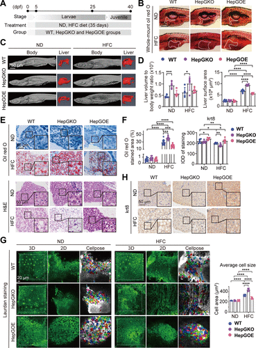 Fig. 3 Hep-gmfb prevents hepatic steatosis and hepatocyte ballooning in MASLD. A: schematic illustration of the construction of zebrafish MASLD model with WT, HepGKO, and HepGOE lines, respectively. B and D: representative whole mount oil red O staining images of zebrafish slices from ND and HFC groups of WT, HepGKO, and HepGOE lines, respectively, with the liver contours indicated by white dotted lines (B), and the quantification of the liver contour areas (D). Scale bar = 750 μm. n = 12 fish per group. One-way ANOVA, ****P < 0.0001 vs. ND or WT group. C and D: representative micro-CT images of the fixed and 4% phosphotungstic acid stained zebrafish from ND and HFC groups of WT, HepGKO, and HepGOE lines, respectively and their livers of 3-D reconstruction (C), and the quantification of the liver volume to body weight (D) from ND and HFC groups of WT, HepGKO, and HepGOE zebrafish. Scale bar = 750 μm. n = 5 fish per group. One-way ANOVA, *P < 0.05, ***P < 0.001 vs. ND or WT group. E: representative H&E and oil red O staining images in liver slices from ND and HFC groups of WT, HepGKO, and HepGOE zebrafish. Oil red O staining shows lipid droplets in liver cells. Scale bar = 50 μm. n = 12 fish per group. F: quantification of oil red O positive staining area for lipid droplets in (E) and krt8 positive staining density in (H) in liver samples from ND and HFC groups of WT, HepGKO, and HepGOE zebrafish. Scale bar = 50 μm. n = 12 fish per group for oil red O staining, and n = 8 fish per group for immunohistochemistry. One-way ANOVA, *P < 0.05, **P < 0.01, ***P < 0.001, ****P < 0.0001 vs. ND or WT group. G: the 3-dimensional (3-D), 2-D, and the Cellpose tool processed representative images of Laurdan stained (green) livers by in vivo imaging the ND and HFC groups of WT, HepGKO, and HepGOE zebrafish with multiphoton fluorescence microscopy and the quantification of cell sizes by measuring individual cellular areas in the Cellpose processed images. Scale bar = 20 μm. n = 8 fish per group. One-way ANOVA, ****P < 0.0001 vs. ND or WT group. H: representative images of anti-krt8 immunochemistry in liver slices from ND and HFC groups of WT, HepGKO, and HepGOE zebrafish. Scale bar = 50 μm. n = 8 fish per group. All experiments were repeated on at least 3 clutches. H&E, hematoxylin and eosin; hep-gmfb, gmfb in hepatocyte; HepGKO, hepatocyte-specific gmfb knockout; HepGOE, hepatocyte-specific gmfb overexpression; HFC, high fat, high cholesterol diet; IOD, integral optical density; krt8, cytokeratin 8; MASLD, metabolism-associated steatotic liver disease; ND, normal diet; WT, wild-type.