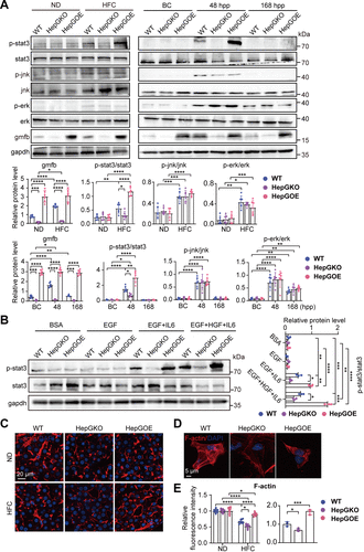 Fig. 6 Gmfb enhances il6/stat3 activation and actin-filaments distribution in zebrafish hepatocytes. A: expression levels of proteins p-stat3, stat3, p-jnk, jnk, p-erk, erk, gmfb, and gapdh normalization control in liver samples from PHX and MASLD models of WT, HepGKO, and HepGOE zebrafish. n = 6 samples, one fish per sample for PHX model and 10 fish per sample for MASLD model. Data were presented as relative expression levels. One-way ANOVA, *P < 0.05, **P < 0.01, ***P < 0.001, ****P < 0.0001 vs. ND, BC, or WT group. B: expression levels of proteins p-stat3, stat3, and gapdh normalization control in zebrafish primary hepatocytes treated with BSA, EGF, EGF plus IL6, or EGF plus HGF plus IL6, respectively. n = 3 samples per group, 8 fish per sample. Data were presented as relative expression levels. One-way ANOVA, *P < 0.05, **P < 0.01, ***P < 0.001, ****P < 0.0001 vs. BSA or WT group. C: representative images of phalloidin stained (red) F-actin in liver slices from ND and HFC groups of WT, HepGKO, and HepGOE zebrafish. Scale bar = 20 μm. n = 8 samples per group, one fish per sample. D: representative images of phalloidin stained (red) F-actin in 24 h post-seeding primary hepatocytes isolated from WT, HepGKO, and HepGOE zebrafish. Scale bar = 5 μm. n = 3 samples per group, 8 fish per sample. E: quantification of phalloidin (red) fluorescence intensity in C and D. One-way ANOVA, *P < 0.05, ***P < 0.001, ****P < 0.0001 vs. ND or WT group. Experiments were repeated on 3 clutches. BC, baseline control; BSA, bovine serum albumin; EGF, epidermal growth factor; erk, extracellularly regulated kinase; gapdh, glyceraldehyde-3-phosphate dehydrogenase; gmfb, glia maturation factor-β; hep-gmfb, gmfb in hepatocyte; HepGKO, hepatocyte-specific gmfb knockout; HepGOE, hepatocyte-specific gmfb overexpression; HFC, high fat, high cholesterol diet; HGF, hepatocyte growth factor; IL6, interleukine 6; jnk, c-jun N-terminal kinase; MASLD, metabolism-associated steatotic liver disease; ND, normal diet; stat3, signal transducer and activator of transcription 3; WT, wild-type.