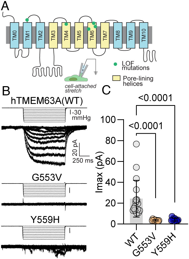 Fig. 1 HLD19-associated TMEM63A mutations are LOF. (A) Topology map of TMEM63A indicating LOF mutation sites. (B) Representative traces of stretch-activated currents induced by negative pipette pressure from HEK-P1KO cells transfected with WT TMEM63A or the indicated mutant. Pressure stimulus trace is illustrated above. (C) Maximal stretch-activated currents (Imax) recorded from WT and variants (n = 18 for WT, n = 10 for mutant constructs, across multiple transfections, One-way ANOVA, Kruskal–Wallis test of multiple comparisons).