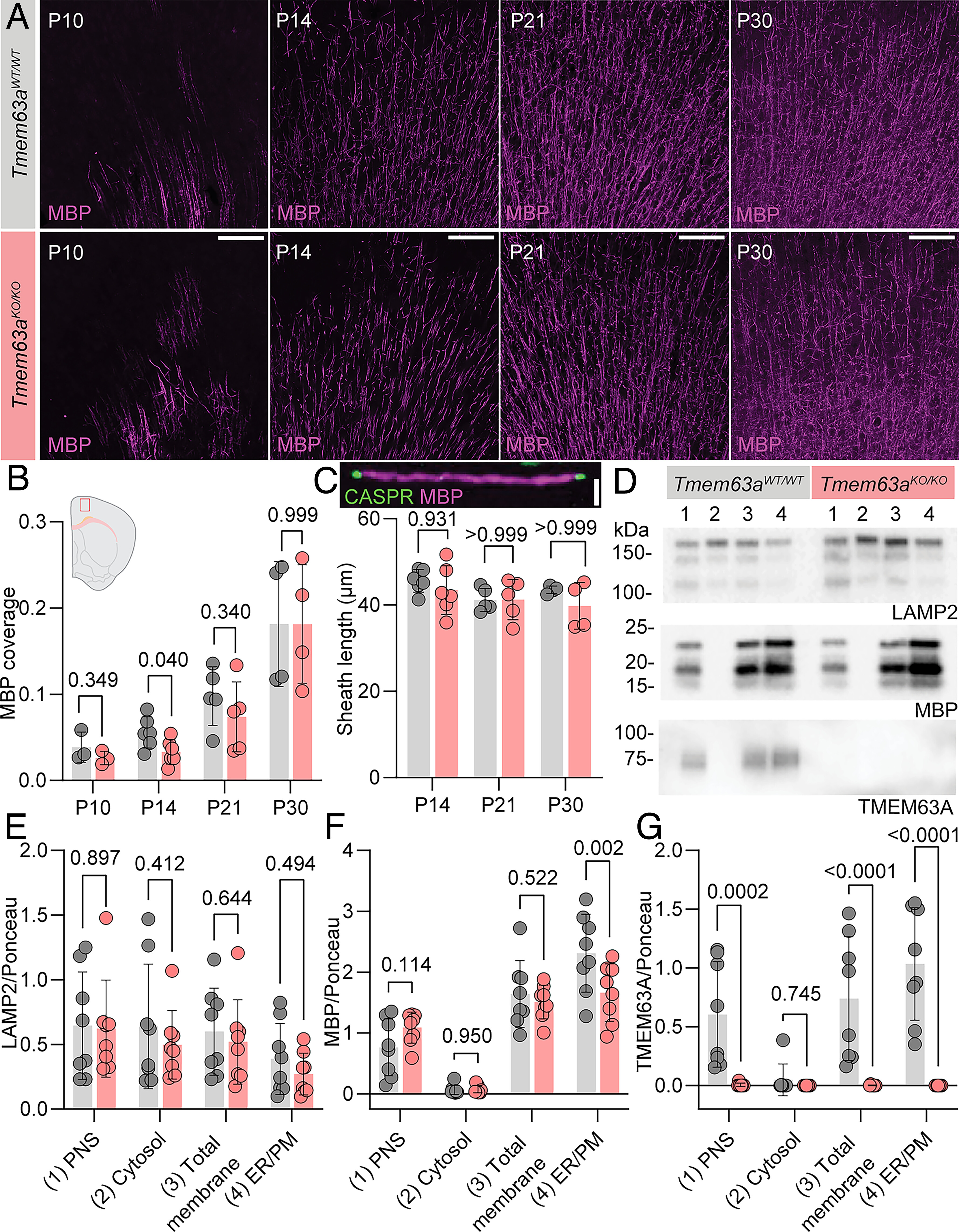 Fig. 4 Delayed myelination in Tmem63a-null mice recapitulates the HLD19 phenotype. (A) Representative micrographs of 50 µm-thick cortical sections immunostained against MBP (magenta) from Tmem63aWT/WT (gray labels) and Tmem63aKO/KO (rose labels) mice at indicated ages. (Scale bar, 100 µm.) (B) MBP coverage in cortical sections, as MBP+ area by total area, for Tmem63aWT/WT and Tmem63aKO/KO mice. Inset region of MBP measurement in the cortex (n = 4 to 6 animals per genotype and age, Brown–Forsythe and Welch ANOVA for multiple comparisons). (C) Internode myelin sheath lengths as MBP+ distance between CASPR labeling (Inset), for Tmem63aWT/WT and Tmem63aKO/KO mice. (n = 4 to 6 animals per genotype and age, One-way ANOVA for multiple comparisons). (Scale bar, 5 µm.) (D) Representative immunoblots of fractions isolated from brain tissue of P30 – P90 Tmem63aWT/WT and Tmem63aKO/KO mice. Blots probed for lysosomal protein LAMP2, myelin-associated protein MBP, and TMEM63A. Lanes: 1) postnuclear supernatant [PNS], 2) cytosol, 3) total cellular membranes [inclusive of ER/PM and lysosomes], 4) ER/PM. Quantification of LAMP2 (E), MBP (F), TMEM63A (G) immunoblot signal density normalized to Ponceau S signal density measured between 100 to 150 kDa (n = 8, 2-way ANOVA and Tukey’s multiple comparison testing).
