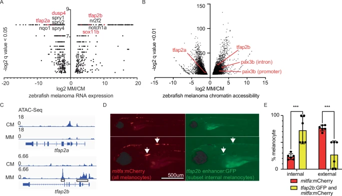Fig. 2 Zebrafish MM has a distinct cellular state from CM. Volcano plots derived from DESeq2 of A bulk RNA-seq from zebrafish MM (n = 5) vs. CM (n = 3) and B ATAC-seq from zebrafish MM (n = 3) vs. CM (n = 3). C IGV plot of ATAC-seq showing chromatin accessibility at tfap2a and tfap2b in zebrafish MM vs. CM. Boxes = loci used for tfap2b reporter. D, E tfap2b enhancer driving GFP preferentially labels internal mitfa-mCherry labeled melanocytes in 6-day old Casper zebrafish. n = 6 zebrafish. D Fluorescent images. Scale bar = 500 μm. E Reporter expression quantification. *** = 0.0003, 2-way ANOVA with multiple comparisons. Mean ± SD. Source data are provided in Source Data Fig. 2E.