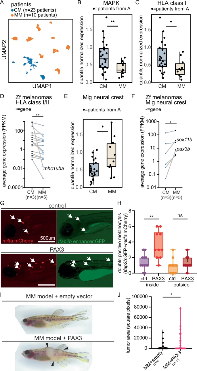 Fig. 4 MM cell state is conserved in patients. A UMAP of scRNA-seq from CM patients (n = 23) and MM patients (n = 10). B, C Normalized pseudobulked gene expression in CM vs. MM cells from scRNA-seq for B MAPK target genes, ** = 0.0036, two-sided t-test, and C HLA Class I antigen presentation genes, * = 0.017, two-sided t-test. Dots = patients. D Average gene expression of expressed zebrafish mhc class I/II genes in zebrafish CM vs. MM. Dots = genes. Lines indicate the same gene in both conditions. ** = 0.0017, Wilcoxon matched-pairs rank test. FPKM = fragments per kilobase of transcript per million. E Normalized pseudobulked gene expression in MM vs. CM cells from scRNA-seq for migratory neural crest genes. * = 0.036, two-sided t-test. F Average gene expression (FPKM) of migratory neural crest genes in zebrafish CMs vs. MMs. Dots = genes. Lines indicate the same gene in both conditions. * = 0.031, Wilcoxon matched-pairs rank test. G, H Melanocyte-specific expression of hPAX3 (n = 10) vs. control (n = 12) in Casper zebrafish with labeled internal melanocytes (double positive mitfa-mCherry and tfap2b-GFP) and pigment removal at 6 dpf. G Representative immunofluorescent images. Scale bar = 500 μm. H Quantification of double positive melanocytes inside and outside zebrafish embryos. ** = 0.0014, ns = 0.7813, ordinary one-way ANOVA with multiple comparisons. I, J hPAX3-vs. empty control-expressing zebrafish MM (CCND1; pten a/b gRNA, tp53 gRNA). I Representative images at 23 weeks post-fertilization and J Tumor area quantification (* = 0.048, two-sided t-test). n = tumors. For all box plots, the box is the 25th to 75th percentile range and whiskers show maximum to minimum. For plots (B, C, E) the middle line represents the median. Source data are provided in Source Data Fig. 4.