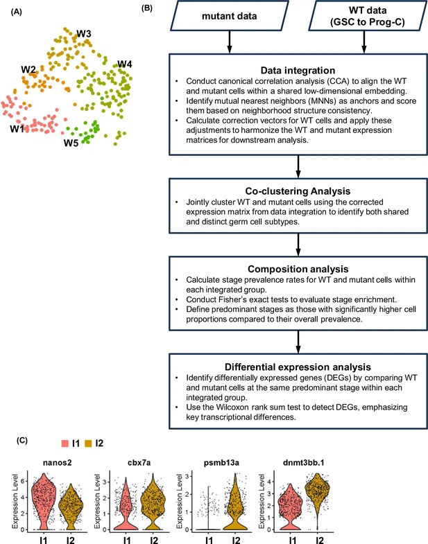 Fig. 3 - Supplemental 2 Transcriptome analysis of integrated groups. (A) Wild-type (WT) germ cells in clusters W1 to W5 visualized by Uniform Manifold Approximation and Projection (UMAP). (B) The flowchart of the co-clustering analysis. (C) Split-violin plots showing the distribution of cells expressing four top germline stem cell (GSC) markers in integrated groups I1 and I2.