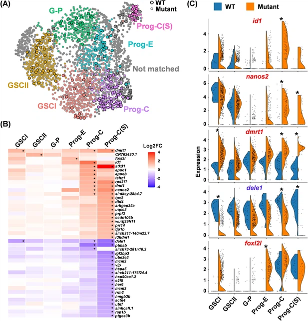 Fig. 4 Identification of differentially expressed genes (DEGs) in wild-type (WT) and foxl2l mutants. (A) Uniform Manifold Approximation and Projection (UMAP) visualization of integrated cells, with six matched stages of WT and mutant cells displayed in different colors. Unmatched cells are labeled in gray. Circles with a black outline: WT cells. Circles with gray outline: mutant cells. (B) Heatmap showing the fold change (FC) between the mutant versus WT (mutant/WT) for all DEGs at each stage. Developmental stages are displayed on the X-axis, and gene names are displayed on the Y-axis. (C) Split-violin plots showing the distribution of cells expressing top DEGs at different development stages (X-axis) between WT and mutant. Asterisks in (B) and (C) indicate significant differences in gene expression between WT and mutants.