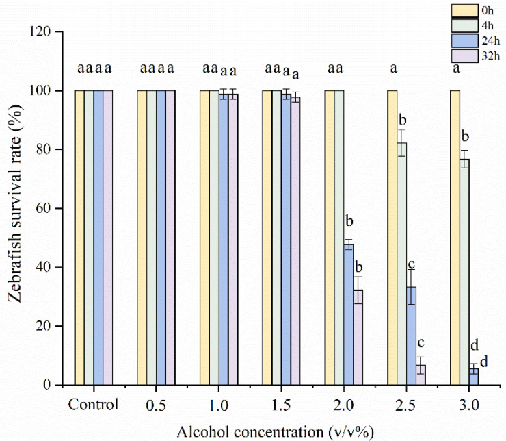 Effect of alcohol concentration on survival of zebrafish. Different lowercase letters represent significant differences within groups (