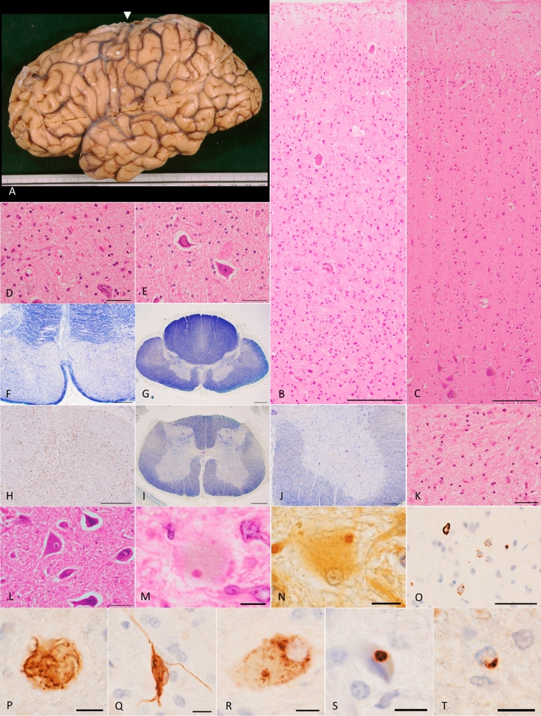 Phosphorylated TDP-43 pathology, Bunina bodies, and severe loss of the upper and lower motor neurons in the older brother (IV-1) with a homozygous c.518dupC frameshift variant in