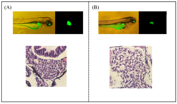 Effect of alcohol on liver injury in zebrafish. Fluorescence intensity of zebrafish liver was observed by fluorescence microscope, and pathology of zebrafish liver tissue: (