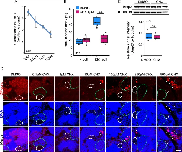 Fig. 1 - Supplemental 3 Effect of cycloheximide on spermatogonia. (A) Dose-dependent protein synthesis by cycloheximide (CHX) in late spermatogonia of the cultured testis. (B) Effect of CHX (1 µM) on BrdU incorporation of cysts of 1- to 4-cell and 32≤-cell spermatogonia in testis organ culture. (C) Western blot analysis of Bmp2 and α-Tubulin (upper panels) and quantification of Bmp2 (lower panel) in the cultured feeder cells with and without 0.2 mM cycloheximide. (D) Toxicity of CHX in cultured testis fragments. CHX was treated with testicular fragments for 48 hr at various concentrations. Note that abnormally strong OP-puro signals indicated by arrowheads including nuclei were detected in cells at 10 mM or more. White dotted line: cysts containing 1- to 4-cell spermatogonia. Green dotted line: cysts containing spermatocytes. Scale bar: 20 µm. For each graph, data were analyzed by Student’s t-test: **p<0.01. ns: no significant difference.