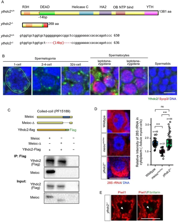 Fig. 3 - Supplemental 1 Mutations of the ythdc2-/-. (A) Zebrafish Ythdc2 protein structure and mutation sequence (*) in the ythdc2 KO zebrafish. (B) Double staining of a testis with anti-Ythdc2 antibody (green) and anti-Sycp3 antibody (red). Staging of spermatogonia was defined by the number of cells in the cyst, and staging of spermatocytes was defined by the patterns of Sycp3. Scale bar: 5 µm. (C) Pull-down assay using full-length or coiled-coil domain-deleted Meioc and Flag-tagged Ythdc2. Schema: conditions of coexpression of each protein in HEK-293A cells used for the pull-down assay. (D) In situ hybridization of 28S rRNA (left panels) and quantification of the 28S rRNA signal intensities (right panels) in wild-type, meiocmo/mo, and ythdc2-/- 1- to 2-cell spermatogonia. The cytoplasmic signal intensities were normalized to the myoid cell cytoplasm. **p<0.01, ns: not significant. (E) Immunostaining against Piwil1 (red) and fibrillarin (green) in ythdc2-/- spermatogonia. Arrowheads: undetectable Piwil1 signals in fibrillarin (green) positive nucleoli under the normal sensitivity imaging of Piwil1.