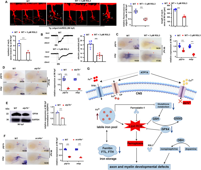 Fig. 6 Effects of unbalanced copper homeostasis and copper non-related ferroptosis on CNS myelin and axon development. (A) oligo2+ cells and the axons in Tg (WT; olig2: dsRED) larvae treated with or without GPX4 inhibitor RSL3 at 96 hpf, and the calculation of the relative fluorescence levels in oligo2+ cell bodies and axons (left), the relative length of axons (right), and the numbers of branch tips in each axon (down)(graphs). (B) Neurons in WT or RSL3 stressed larvae differed in current amplitudes at 96 hpf, with neurons in WT larvae having significantly larger current amplitudes and densities (graphs). (C) Transcriptional expressions of CNS myelin markers mbp and plp1a in WT or RSL3-treated larvae at 96 hpf, and the calculation of the relative expression of mbp and plp1a (box and whisker plots). (D) Transcriptional expressions of CNS myelin markers mbp and plp1a in WT or atp7b−/− larvae at 96 hpf, and the calculations of the relative expressions of mbp and plp1a (box and whisker plots). (E) Western blotting (WB) analysis of the relative protein level of GPX4 in WT or atp7b−/− at 96 hpf, with GADPH as an internal control (graphs). (F) Transcriptional expressions of CNS myelin markers mbp and plp1a in WT or acsl4a−/− larvae at 96 hpf, and the calculations of the relative expressions of mbp and plp1a (box and whisker plots). (G) Working model of atp7a deficiency in inducing developmental defects in axonal and myelin development via ferroptosis in zebrafish. Atp7a functional deficiency leads to damaged iron homeostasis (iron overload) and increased lipid peroxidation, and the subsequent down-regulation of GPX4 and the resulted in ferroptosis in zebrafish larvae, especially in CNS OPCs, and then leads to axon myelin and extension developmental defects and dysfunctional locomotor in zebrafish. C, D, F, lateral view, anterior to the left. Scale bar: 50 μm (A), 10 μm (A, enlarged picture), 100 μm (C, D, F). *P < 0.05, **P < 0.01, ***P < 0.001. NS, not significant.