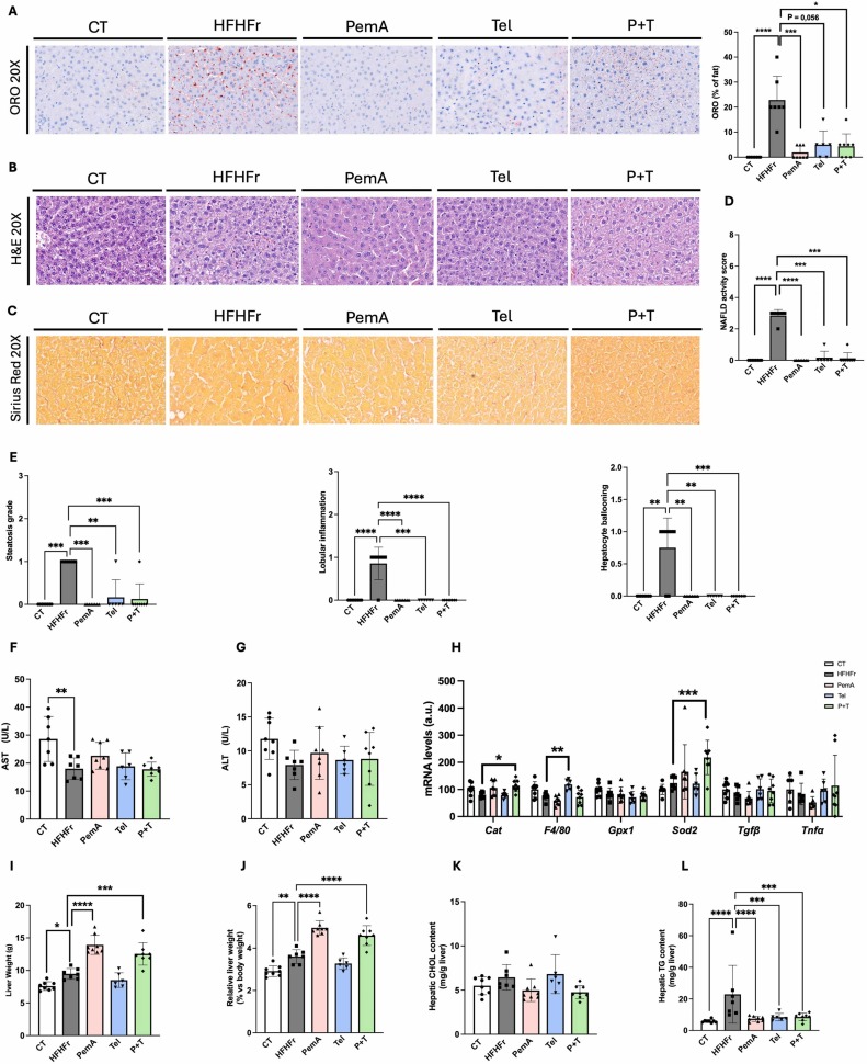 Fig. 2 Treatment with PemA, Tel and their combination reduces the NAFLD activity score (NAS). Representative images of Oil Red O (A), Hematoxylin-Eosin (B) and Sirius Red (C) stained sections of liver samples, along with the corresponding histological analysis of CT, HFHFr, PemA, Tel and P + T groups. (D) shows NAFLD activity score, and (E) the subcomponent scores. Serum levels of AST (F), ALT (G), and (H) relative mRNA levels of markers of inflammation/oxidative stress and fibrosis. Absolute (I) and relative (J) liver weight. Hepatic content of cholesterol (K) and TG (L). Quantitative results are presented as bar plots with individual values, showing the mean ± SD of 6–8 animals/group. *P < 0.05, **P < 0.01, ***P < 0.001, ****P < 0.0001.