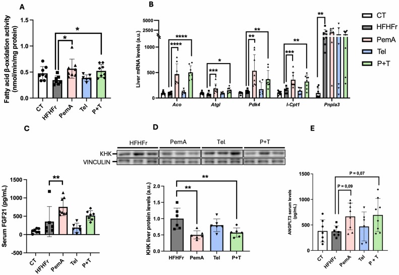 Fig. 3 Treatment with PemA increased hepatic fatty acid oxidation. (A) Fatty acid β-oxidation activity and (B) mRNA levels of genes related to fatty acid catabolism. Serum FGF21 (C) and ANGPTL3 (E) levels from all experimental groups. (D) Relative content of KHK protein levels in liver samples, along with the representative Western Blot bands from HFHFr, PemA, Tel and P + T groups. Quantitative results are presented as bar plots with individual values, showing the mean ± SD of 6–8 animals/group. *P < 0.05, **P < 0.01, ***P < 0.001, ****P < 0.0001.