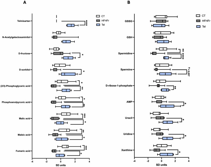 Fig. 8 Relevant liver metabolites involved in the antisteatotic effect of telmisartan. Box plots showing the levels of metabolites involved in gluconeogenesis and polyol pathways (A), and those related to pentose phosphate pathway and purine/pyrimidine metabolism (B). Metabolite signal intensities were Z-score normalized for plotting purposes. Statistical analysis was performed with raw data from 6 to 8 animals per group. *P < 0.05. **P < 0.01, ***P < 0.001, ****P < 0.0001.