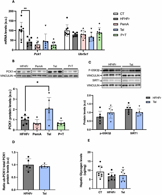 Fig. 9 Telmisartan effects on PCK1 expression. (A) Relative liver mRNA levels of Pck1 and Ubr5 from CT, HFHF and Tel groups. (B, C) Relative liver protein levels of PCK1, p-GSK3β and SIRT1 from the corresponding experimental groups. On the upper part of the figures, representative western blot bands are shown. (D) Ubiquitinated PCK1 protein levels relative to total PCK1 protein levels in the livers from CT, HFHFr and Tel groups. (E) Hepatic glycogen content from CT, HFHFr and Tel groups. Quantitative results are presented as bar plots with individual values, showing the mean ± SD of 6–8 animals/group. *P < 0.05, **P < 0.01.