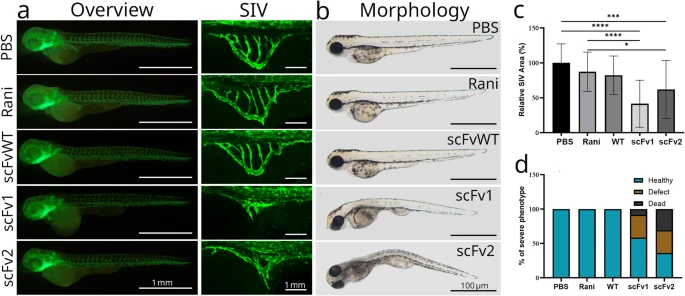 Fig. 4 In vivo angiogenesis inhibition tests. Anti-VEGFs were injected into the yolk of 2 dpf embryos, prior to the onset of SIV angiogenesis and embryos were imaged with stereomicroscope at 3 dpf. (A) Overview images of the transgenic fish showing vasculature (left), representative close-up images of SIV recorded at the confocal microscope (right). (B) Representative images showing the morphologies of injected embryos at 3 dpf. Whole body images were acquired with brightfield (right) and fluorescent stereomicroscope (left) and SIV images were acquired with confocal microscope (middle). Statistical significance was tested with one-tail T-test with a confidence interval of 95%, with Excel software (Microsoft, Redmond, WA, USA). Error bars represent SD. ns: non-significant, * P ≤ 0.05, ** P ≤ 0.01, *** P ≤ 0.001, **** P ≤ 0.0001. (C) Plot of average SIV area of each group is presented. SIV area was measured in 24 embryos (normal or defective morphology) in each experimental group. Two independent experiments were conducted with similar results. (D) Plot showing ratio of healthy (blue), defective (orange) or dead (black) embryos injected with antibodies or PBS. Sample size (n) = 40 (PBS), 38 (ranibizumab), 37 (scFvWT), 36 (scFv1), 39 (scFv2) 39. Two independent experiments were conducted with similar results.