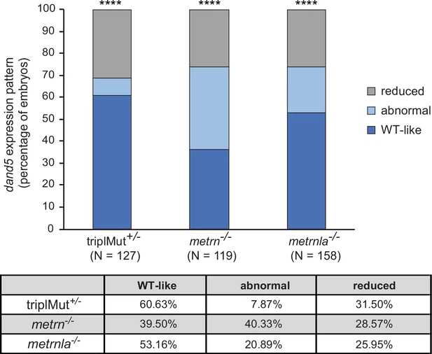 Fig. 2 - Supplemental 1 Nodal factors gene expression is altered in the absence of Metrns. Quantification of the number of embryos in percentage with reduced, inverted, or wild type (WT) -like dand5 expression pattern in 14 hpf triplMut+/-, metrn-/-, and metrnla-/- embryos, compared to WT. Permutation test, ****p-value <1.0e-5 for triplMut+/-, ****p-value <1.0e-5 for metrn-/-, ****p-value <1.0e-5 for metrnla-/