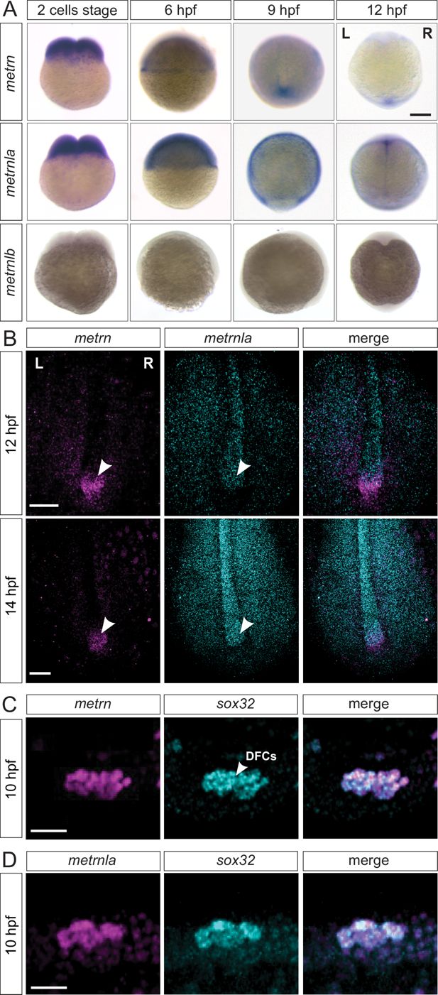 Fig. 3 Metrns are expressed during early zebrafish development. (A) Expression patterns of metrn, metrnla, and metrnlb during early embryonic development from two-cell stage to 12 hpf. (9 hpf and 12 hpf dorsal view) (B) Confocal cross-section of the midline region of 12 and 14 hpf zebrafish embryos showing mRNA expression of the metrn (magenta) and metrnla (cyan) and their co-expression in the area of the Kupffer’s vesicle (KV, indicated by arrowheads) by HCR. (C) Metrn and sox32 are co-expressed by dorsal forerunner cells (DFCs) as shown by double fluorescence in situ hybridization against metrn (magenta) and sox32 (cyan) on 10 hpf wild type embryos. (D) Metrnla and sox32 are co-expressed by DFCs as shown by double fluorescence in situ hybridization against metrnla (magenta) and sox32 (cyan) on 10 hpf wild type embryos. Scale bars in (A): 500 μm, (B) 250 μm, (C) and (D): 50 μm. L=left, R=right.
