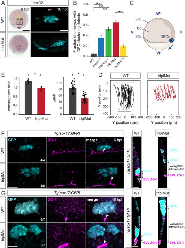 Fig. 4 Metrns loss-of-function leads to DFC clustering and migration defects. (A) Dorsal views of sox32 expression in DFCs at 9 hpf and 10 hpf (cyan) in wild type (WT) and triplMut embryos reveal DFC misclustering in triplMut embryos. (B) Quantification in fraction of embryos with DFC clustering defects at 9 hpf in WT, metrn-/-, metrnla-/-, triplMut, and triplMut+/- embryos (Fisher exact test, ***p-value: 1.6e-07 for WT vs. metrn-/-; ***p-value: 3.5e-40 for WT vs. metrnla-/-; ***p-value: 1.5e-49 for WT vs. triplMut and ***p-value: 7.9e-15 for triplMut vs. triplMut+/-). Error bars indicate standard deviation. (C) Lateral view of a schematic representation of an 8 hpf zebrafish embryo visualizing animal pole (AP) to vegetal pole (VP) dorsal forerunner cell (DFC) migration from both poles. Created with BioRender.com. (D) Tracking plots of combined DFC movement in wild type (left) and triplMut embryos (right) (n=3 embryos per condition, single embryo traces see Figure 5—figure supplement 1D) showing directed DFC movement in both conditions. Bars indicating the analyzed stretch of tracked cells along the y-axis at the beginning and end of each recording. (E) Plots for convergence (upper) and migration speed (lower) analyzed from DFC tracking data show a significant decrease in these parameters in triplMut embryos compared to WT controls. (*p-value convergence ratio: 0.0295; ***p-value for migration speed 1.217e-04) Error bars indicate standard deviation.(F–G) GFP and ZO-1 immunostainings of the dorsal margin and confocal microscopy ZY-planes (right panels) of Tg(sox17:GFP) WT and triplMut embryos at (F) 6 hpf and (G) 8 hpf (shield stage and 75% epiboly) showing the apical domains of marginal DFCs with ZO-1 enriched junction points (arrowheads) and revealing the absence of apical ZO1-enrichment and detachment from the EVl/YSL in triplMut embryos. EVL, enveloping layer; DC, deep cells; YSL, yolk syncytial layer; D, dorsal; V, ventral. Scale bars in (A): 50 μm, (F–G): 50 μm. AP = animal pole, VP = vegetal pole.