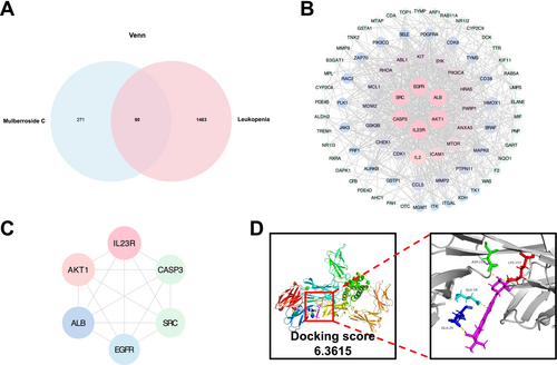 Fig. 1 Identification of Mulberroside C (MC) targets in leukopenia through network pharmacology and molecular docking analysis. (A) A Venn diagram illustrating the overlapping targets of MC and leukopenia. (B) The MC-target-leukopenia interaction network in Cytoscape v3.7.1. (C) Protein–protein interaction (PPI) network highlighting the core targets of MC in combating leukopenia. (D) The binding affinity of MC with its core target, IL-23 receptor (IL23R).