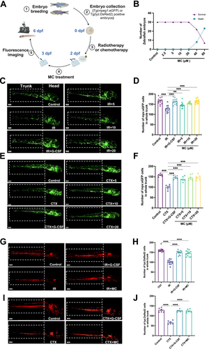 Fig. 3 Effects of Mulberroside C (MC) on leukopenia in zebrafish. (A) Timeline of the zebrafish intervention protocol. Effect of granulocyte colony-stimulating factor (G-CSF, 25 μg/L) or MC (5–20 μM) in irradiated or cyclophosphamide-treated transgenic zebrafish Tg(mpeg1: EGFP) and Tg(lyz: DsRed). (B) Toxicity of MC (2.5–80 μM) on zebrafish survival and development at 2 days postfertilization (2 dpf). n = 30. (C) Fluorescent imaging of mpx: EGFP-positive cells in irradiated Tg(mpeg1: EGFP) transgenic zebrafish at 6 dpf. (D) Quantification of mpx:EGFP-positive cells in each group. n = 12. (E) Fluorescent imaging of mpx:EGFP-positive cells in cyclophosphamide-treated Tg(mpeg1: EGFP) zebrafish at 6 dpf. (F) Quantification of mpx:EGFP-positive cells in each group. n = 6. (G) Fluorescent imaging of lyz:DsRed-positive cells in irradiated Tg(lyz: DsRed) transgenic zebrafish at 6 dpf. (H) Quantification of lyz: DsRed-positive cells in each group. n = 12. (I) Fluorescent imaging of lyz: DsRed-positive cells in cyclophosphamide-treated Tg(lyz: DsRed) transgenic zebrafish at 6 dpf. (J) Quantification of lyz: DsRed-positive cells in each group. n = 6. Data are expressed as the mean ± SEM. **p < 0.01; ***p < 0.001; ****p < 0.0001 versus the model group.