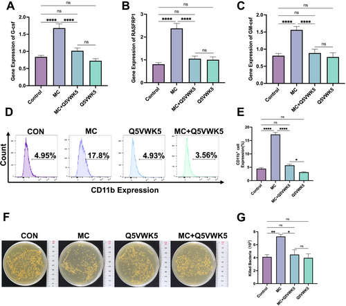 Fig. 10 Mulberroside C (MC) stimulates leukopenia through the IL-23 receptor (IL23R). NB4 cells were treated with MC (20 μM), Q5VWK5 (IL-23R inhibitor, 6.7 μM), or a combination of MC (20 μM) + Q5VWK5 (6.7 μM) for 5 days. qRT-PCR analysis (n = 3) of, (A) G-CSF expression, (B) RASGRP1 expression, (C) GM-CSF expression, (D) Flow cytometry analysis of CD11b expression, (E) Histogram illustrating the percentage of CD11b-expressing cells across different groups. n = 3. (F) Evaluation of bactericidal activity. (G) Bacterial killing assay results are presented as histograms, showing the number of bacteria killed in each group. n = 3. Data are expressed as the mean ± SEM. *p < 0.05; **p < 0.01; ****p < 0.0001 versus corresponding control groups. ns = no significance.