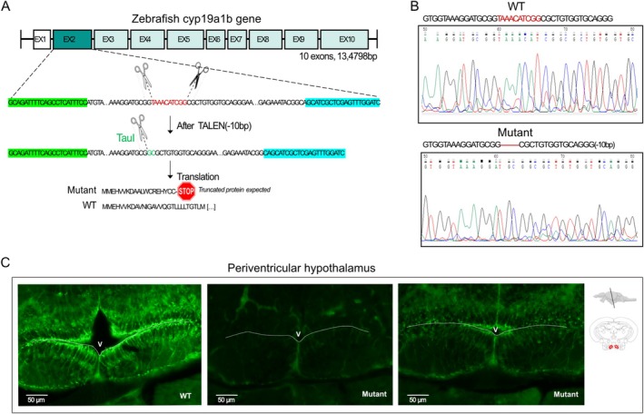 Cyp19a1b mutant zebrafish characterization. (A) The position of the 10 deleted nucleotides is shown on the top (red sequence), and the corresponding truncated protein is indicated below the gene sequence. The restriction enzyme cut site used for genotyping is written in green (TauI). Primer sequences used for genotyping are highlighted in green (forward) and blue (reverse). (B) Sequencing of the cyp19a1b gene in WT and mutant zebrafish showing the nucleotide deletion in exon 2. (C) Periventricular hypothalamus sections of AroB immunoreactivity in WT and mutant fish. Scale bars: 50 μm.