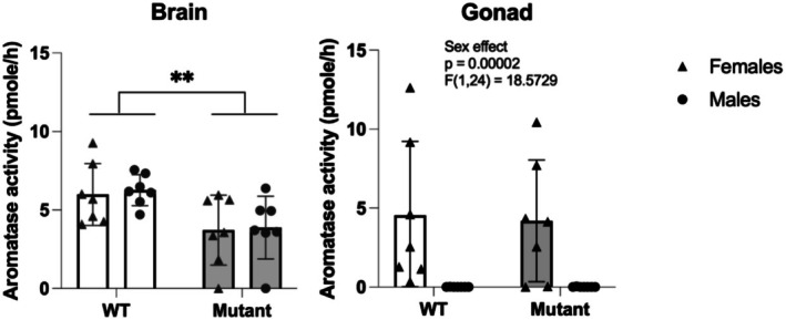 Aromatase activity expressed in pmole per hour in the brain and the gonad of WT and mutant adult zebrafish, in males and females. n = 7 in each group. Mean ± SEM; **p < 0.001 versus WT group.