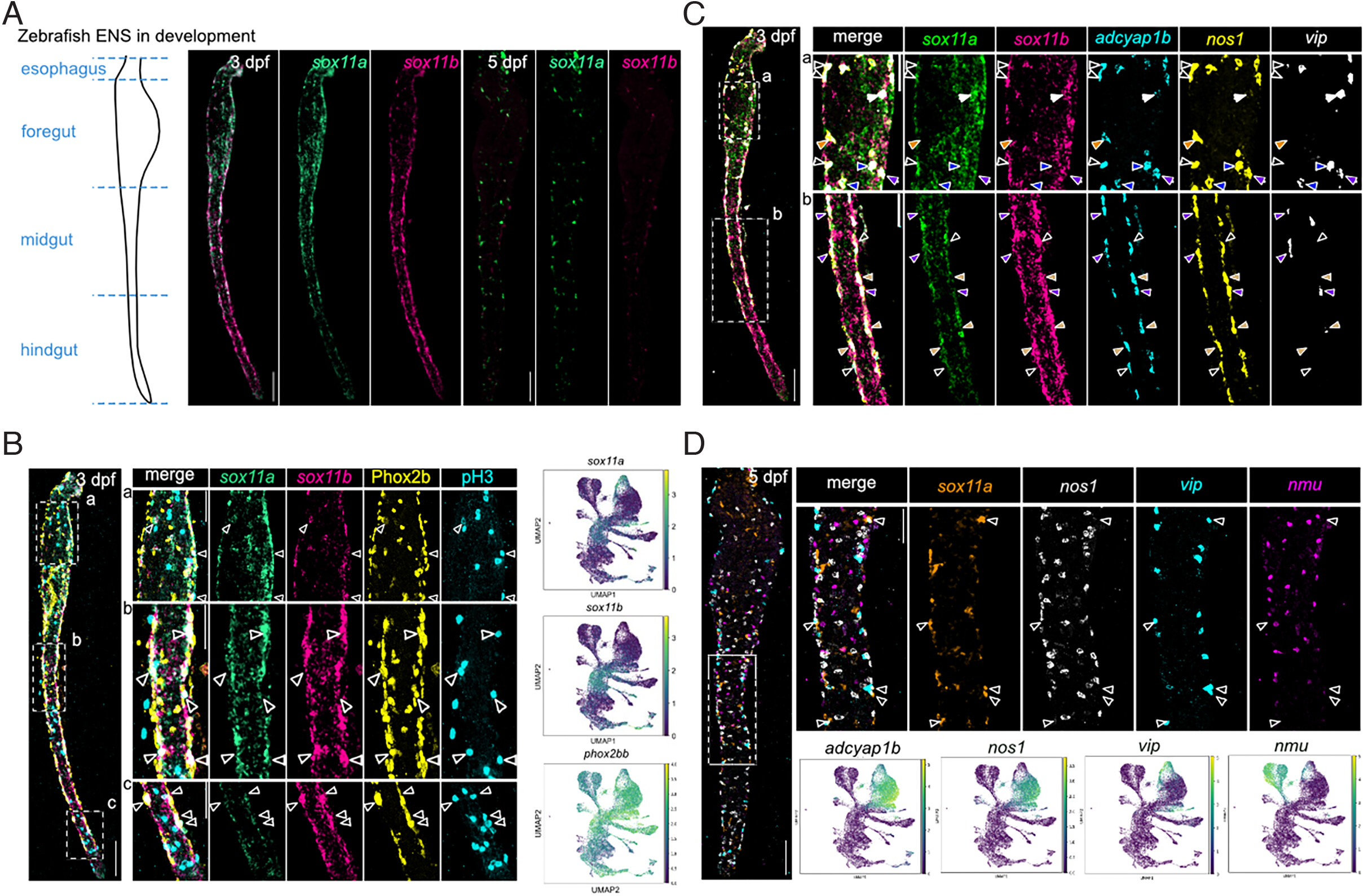 Fig. 2 Sox11a and sox11b expression overlap with inhibitory motor neuron clusters. All staining images were after “Max Intensity” z-stack projection. (A) Left: Illustration of zebrafish developing ENS separated into foregut, midgut, and hindgut. Right: Transient expression of both sox11a and sox11b in gut at 3 dpf, and only sox11a expression at 5 dpf. (Scale bar, 100 μm.) (B) Overlapping expression of sox11a, sox11b, Phox2b, and pH3 in the ENS at 3 dpf. The white dash box indicates the zoomed region on the right. Arrows indicate cells coexpressing sox11a/b, Phox2b and proliferation marker pH3. (Scale bar, 100 μm, and 50 μm for zoomed region.) (C) Coexpression pattern between sox11a, sox11b, and inhibitory motor neuron markers, adcyap1b, vip, and nos1 at 3 dpf. The white dash box indicates the zoomed region on the right. Arrows point to cells coexpressing sox11a/b and neuronal markers: hollow arrows:sox11a+/sox11b+/adcyap1b+/nos1+/vip− cells, white arrows:sox11a+/sox11b+/adcyap1b−/nos1−/vip+ cells, orange arrows:sox11a−/sox11b+/adcyap1b+/nos1+/vip− cells, purple arrows:sox11a+/sox11b+/adcyap1b+/nos1+/vip+ cells, blue arrows:sox11a+/sox11b−/adcyap1b+/nos1+/vip+ cells. (Scale bar, 100 μm, and 50 μm for zoomed region.) (D) Coexpression pattern between sox11a and only vip at 5 dpf. The white dash box indicates the zoomed region on the right. Arrows indicate cells coexpressing sox11a and vip. (Scale bar, 100 μm, and 50 μm for zoomed region.)