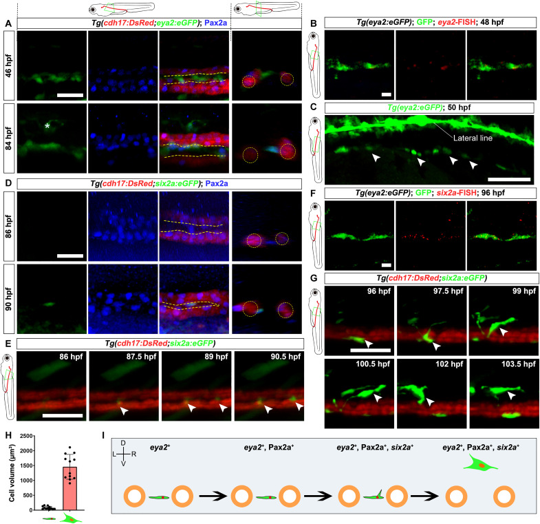 (A) Confocal images of Pax2a immunofluorescence in Tg(cdh17:DsRed;eya2:eGFP) zebrafish show that eya2+ cells emerge at 46 hpf, and these cells start expressing Pax2a by 84 hpf. cdh17:DsRed labels renal tubular epithelial cells. The asterisk indicates other eya2:eGFP+ cell types that have yet to be identified. The yellow dashed lines indicate the intermediate region between the two renal tubules. The line diagram at the top indicates that the images were captured from zebrafish embryos. The red lines represent the renal tubules, while the green box indicates the region and orientation of image acquisition. (B) Combination of eya2-FISH and GFP immunofluorescence in Tg(eya2:eGFP) zebrafish at 48 hpf. (C) Confocal image showing Tg(eya2:eGFP) zebrafish at 50 hpf. Arrowheads indicate RSCs arranged in a cord-like structure. The structure above it is the lateral line. (D) Confocal images of Pax2a immunofluorescence in Tg(cdh17:DsRed;six2a:eGFP) zebrafish at 86 and 90 hpf, demonstrating that six2a is first expressed at 90 hpf. (E) Time-lapse observation of Tg(six2a:eGFP;cdh17:DsRed) zebrafish from 86 to 90.5 hpf. Arrowheads indicate six2a:eGFP+ RSCs. (F) Combination of six2a-FISH and GFP immunofluorescence in Tg(eya2:eGFP) zebrafish at 96 hpf. (G) Time-lapse observation of Tg(cdh17:DsRed;six2a:eGFP) zebrafish from 96 to 103.5 hpf. Arrowheads indicate six2a:eGFP+ RSC. (H) The cell volume of six2a:eGFP+ RSCs in (G) (96 and 103.5 hpf) was measured using ImageJ (n = 12 cells from three fish). (I) Graphical abstract summarizing RSC generation. A subset of eya2+ mesenchymal cells begins to express Pax2a at approximately 84 hpf, followed by the expression of six2a, which facilitates the maturation of RSCs. Yellow circles represent cross sections of the pronephric tubules, and green cells denote RSCs. Axial orientation is shown in the top left corner, indicating the dorsal (D)–ventral (V) and left (L)–right (R) axes. Scale bars, 50 μm [(A) to (G)].
