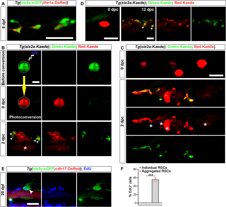 (A) Confocal images of Tg(six2a:eGFP;lhx1a:DsRed) zebrafish at 8 dpf show that six2a:eGFP+ RSCs begin to express lhx1a at this stage. (B) Confocal images showing six2a:Kaede+ RSC aggregate before and after photoconversion. Only the circled area was photoconverted. The asterisk indicates red Kaede+ nascent nephrons, while arrowheads indicate nascent RSCs. dpc, days postphotoconversion. (C) In individuals where all RSCs that had formed aggregates were photoconverted, nascent RSCs exhibited red fluorescence at 2 dpc. Asterisks indicate red Kaede+ nascent nephrons. (D) Long-term photoconversion-based lineage tracing revealed that nascent RSCs were capable of forming cell aggregates in newly formed nephrons at 12 dpc. Arrowheads indicate newly formed RSC aggregates. (E) EdU assay of Tg(six2a:eGFP;cdh17:DsRed) zebrafish at 20 dpf. EdU incorporation is primarily observed in RSC aggregate (arrowhead) rather than in individual RSCs (asterisk). (F) Quantification of EdU+ RSCs from (E), showing the proportion of EdU+ cells within aggregates or as individual RSCs. n = 3 fish, with 30 cells analyzed per group within each fish. Scale bars, 50 μm [(A) to (E)].