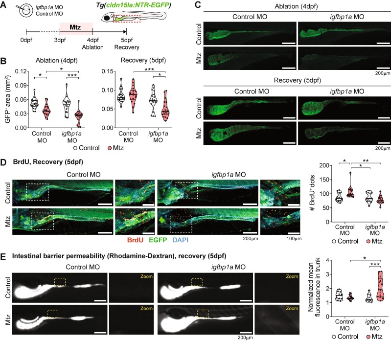Fig. 5 Knockdown of igfbp1a affects intestinal regeneration after Mtz-induced damage. (A) Experimental design for morpholino-mediated knockdown experiments. (B) GFP+ intestinal area measurements in control and igfbp1a morphants during ablation and recovery. Pooled data from 2 independent experiments are shown (1 dot = 1 larva). (C) Representative confocal images of the intestines of analyzed groups. Scale bar = 200 µm. (D) BrdU incorporation in control and igfbp1a morphants during recovery (5dpf). Scale bar = 200 µm in whole-intestine pictures and 100 µm in zoomed area. Pooled data from 2 independent experiments (1 dot = 1 larva). (E) Intestinal permeability of control and igfbp1a morphants during recovery (5dpf) assessed by oral gavage of rhodamine-dextran. Normalized mean fluorescence in the trunk was measured. Scale bar = 200 µm. Pooled data from 2 independent experiments (1 dot = 1 larva). Different symbol shapes denote independent experiments in B, D, and E. Two-way ANOVA with Tukey’s post-tests were performed in B, D, and E. *p < 0.05; ***p < 0.001.