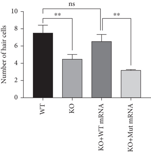 Fig. 2f Characterization of prps1a gene editing and phenotypic analysis in zebrafish. (a) Schematic of the zebrafish prps1a gene structure, highlighting the gRNA target sites. Arrows indicate gRNA binding sites, with exons represented as boxes. (b) Sequencing analysis of mutations induced by the two gRNAs showing various mutation types, including insertions, deletions, and substitutions. (c) Validation of gRNA activity through cleavage assays, assessing the efficiency of double-strand break induction by each gRNA. (d) Hair cell staining in zebrafish larvae across four experimental groups: wild-type (WT), gene KO, KO with wild-type mRNA injection (KO+WT mRNA), and WT with Cys165Tyr mutant mRNA injection (WT+Cys165Tyr). Scale bar = 200 μm. (e) Confocal microscopy images of hair cells in zebrafish larvae from different experimental groups showing structural integrity and localization. Scale bar = 20 μm. (f) Quantification of hair cells in different experimental groups. (g) Behavioral tracking of zebrafish larvae, recording movement patterns to assess the impact of prps1a gene editing on behavior. (h) Line graph of swimming distance of zebrafish with different genotypes under noise. (i) Statistical analysis of behavioral data of total distance. (j) Statistical analysis of behavioral data of first distance. (k) Representative microscopic images of hair cells stained with AO in zebrafish larvae from different experimental groups. Scale bar = 100 μm. (l) Quantification of fluorescence intensity in hair cells of the larvae. Data were compared using ANOVA followed by post hoc tests, with significant differences indicated (p < 0.05). Data are presented as mean ± SD. ∗p < 0.05, ∗∗p < 0.01, ∗∗∗p < 0.001, and ∗∗∗∗p < 0.0001.