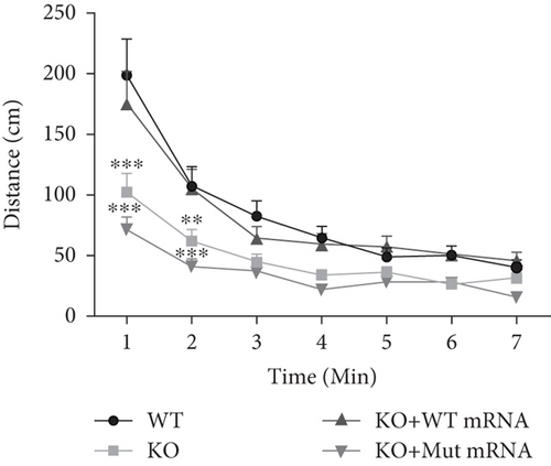 Fig. 2h Characterization of prps1a gene editing and phenotypic analysis in zebrafish. (a) Schematic of the zebrafish prps1a gene structure, highlighting the gRNA target sites. Arrows indicate gRNA binding sites, with exons represented as boxes. (b) Sequencing analysis of mutations induced by the two gRNAs showing various mutation types, including insertions, deletions, and substitutions. (c) Validation of gRNA activity through cleavage assays, assessing the efficiency of double-strand break induction by each gRNA. (d) Hair cell staining in zebrafish larvae across four experimental groups: wild-type (WT), gene KO, KO with wild-type mRNA injection (KO+WT mRNA), and WT with Cys165Tyr mutant mRNA injection (WT+Cys165Tyr). Scale bar = 200 μm. (e) Confocal microscopy images of hair cells in zebrafish larvae from different experimental groups showing structural integrity and localization. Scale bar = 20 μm. (f) Quantification of hair cells in different experimental groups. (g) Behavioral tracking of zebrafish larvae, recording movement patterns to assess the impact of prps1a gene editing on behavior. (h) Line graph of swimming distance of zebrafish with different genotypes under noise. (i) Statistical analysis of behavioral data of total distance. (j) Statistical analysis of behavioral data of first distance. (k) Representative microscopic images of hair cells stained with AO in zebrafish larvae from different experimental groups. Scale bar = 100 μm. (l) Quantification of fluorescence intensity in hair cells of the larvae. Data were compared using ANOVA followed by post hoc tests, with significant differences indicated (p < 0.05). Data are presented as mean ± SD. ∗p < 0.05, ∗∗p < 0.01, ∗∗∗p < 0.001, and ∗∗∗∗p < 0.0001.