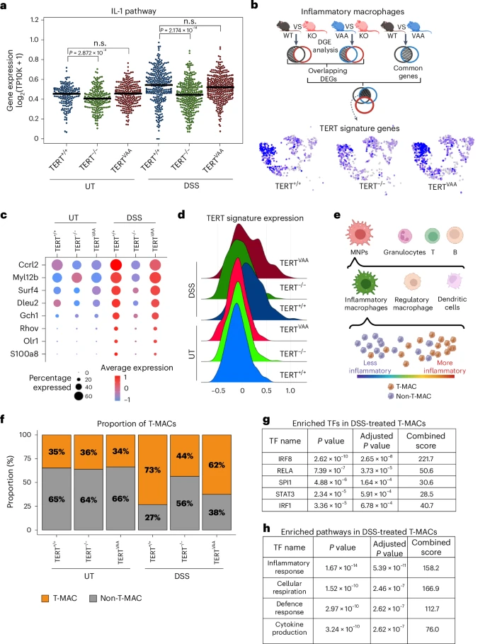 Fig. 5 Single-cell analysis revealed a TERT-driven myeloid subpopulation. a, The swarm plot shows the average expression of IL-1 pathway genes in inflammatory macrophage clusters of DSS-treated or untreated TERT+/+, TERTVAA and TERT−/− groups. (UT TERT+/+ n = 164, UT TERT−/− n = 217, UT TERTVAA n = 252, DSS TERT+/+ n = 314, DSS TERT−/− n = 341, DSS TERTVAA n = 305 cells). The line indicates the median expression. P values were calculated by two-sided Mann–Whitney test (n.s., not significant). b, Simplified schematic approach of TERT signature gene set identification. Multiple pair comparisons between untreated and DSS-treated TERT+/+ (WT), TERTVAA (VAA) and TERT−/− (KO) inflammatory macrophages revealed genes that are significantly upregulated in DSS-treated TERT+/+ and TERTVAA but not in TERT−/−. UMAPs show the average expression of TERT signature genes in MNPs of TERT+/+, TERTVAA and TERT−/− groups. c, The feature plot shows the TERT signature genes across genotypes with and without DSS treatment. d, The average expression of TERT signature genes in TERT+/+, TERTVAA and TERT−/− groups with or without DSS treatment. e, A schematic representation of T-MAC identification. Cells highly expressing TERT signature genes among inflammatory macrophages are annotated as T-MACs and lowly expressing ones as non-T-MAC. f, The bar plot shows the proportion of T-MAC and non-T-MAC cells in inflammatory macrophages of TERT+/+, TERTVAA and TERT−/− groups with or without DSS treatment. g, The list of transcription factors (TF) enriched in controlling DEGs that are downregulated in TERT−/− T-MAC cells than the TERT+/+ T-MACs upon DSS treatment. P values were calculated by two-sided Fisher exact test. h, The list of enriched pathways based on the upregulated genes in DSS-treated TERT+/+ T-MACs compared with untreated TERT+/+ T-MACs. P values were calculated by two-sided Fisher exact test. P values for a: UT-TERT+/+-versus-UT-TERT−/−, P = 2.872 × 10−4; DSS-TERT+/+-versus-DSS-TERT−/−, P = 2.174 × 10−14. Panels b and e created with BioRender.com. Source numerical data are available in Source data.