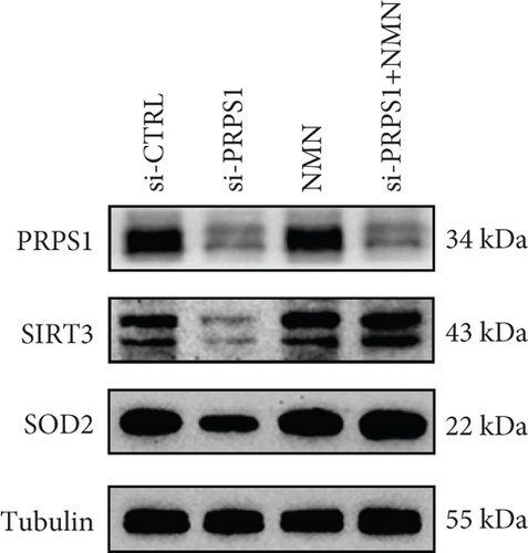 Fig. 4a PRPS1 knockdown regulates intracellular ROS levels and mitochondrial function via the NAD+/SIRT3/SOD2 pathway in HEI-OC1 cells. (a) Western blot analysis of PRPS1, SIRT3, and SOD2, with tubulin as the internal control. (b) Quantification of protein expression levels from (a). (c) SOD activity measured using a total superoxide dismutase assay kit with WST-8. (d) Representative microscopic images of HEI-OC1 cells stained with DCFH-DA in each group. Scale bar = 20 μm. (e, f) Flow cytometry analysis of DCFH-DA staining, showing quantitative changes in green fluorescence. (g) Representative microscopic images of HEI-OC1 cells stained with TMRM in each group. Scale bar = 20 μm. (h, i) Flow cytometry analysis of TMRM staining, showing quantitative changes in fluorescence. Data are presented as mean ± SD from three independent experiments. ∗p < 0.05, ∗∗∗p < 0.001, and ∗∗∗∗p < 0.0001 compared with si-CTRL; ####p < 0.0001 compared with si-PRPS1.