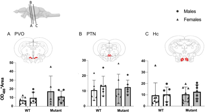 Expression of 5‐HT in positive cells in WT and mutant fish. (A) Paraventricular organ (PVO). (B) Posterior tuberal nucleus (PTN). (C) Caudal zone of periventricular hypothalamus (Hc). Red dots on frontal brain section drawings indicate areas of interest where expression is observed. Mean ± SEM.