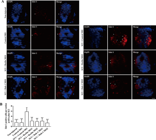 Fig. 6 Immunohistochemical analysis of motor neuron numbers in cross-sections of spinal cords caudal to the lesion site at 60 h after SCI in Reelin MO–, Dab-1 MO– and control MO–treated larvae. (A) Micrographs show DAPI staining (left panel, blue) and Islet 1–positive motor neurons (middle panel, red) being merged (right panel) at 40× magnification. Arrowheads denote Islet 1–positive motor neurons. Scale bar, 50 μm. (B) Quantification of numbers of Islet 1–positive motor neurons in spinal cord sections after treatment with Reelin, Dab-1 and control MOs. Data are from 60 sections per group. Five sections were analysed per animal and 12 animals were in each group in three independent experiments. Data represent means ± SEM, SCI plus Con MO versus all groups, ***p < 0.001, one-way ANOVA with Tukey's post hoc test.